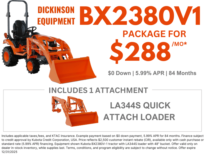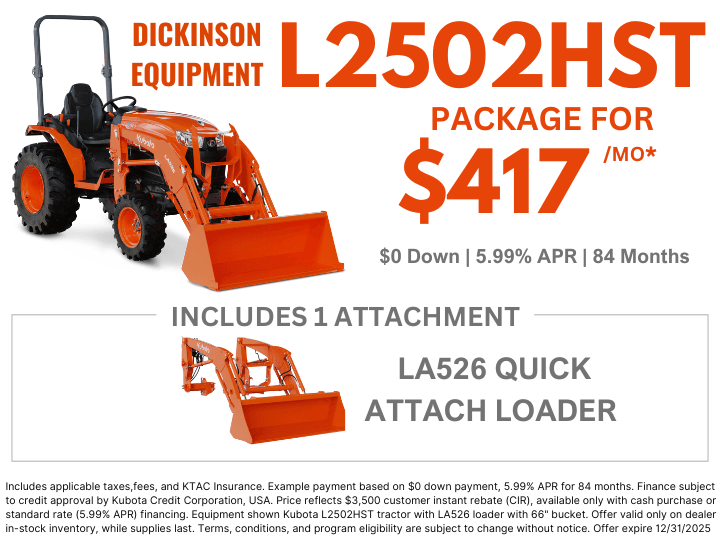If you're looking for quality equipment and exceptional services provided by trained experts, you've come to the right place. At Dickinson Equipment Inc., we pride ourselves on matching each customer's unique needs with the Kubota that will serve them best. We're glad you're here, where you can check out our inventory, order parts, schedule a service appointment or simply give us a call at (540) 786-8383 and let us know how we can help you.