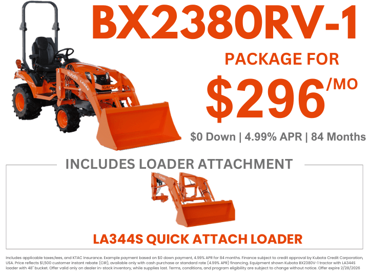 0% APR available or save with cash discount on your new Kubota BV Series!