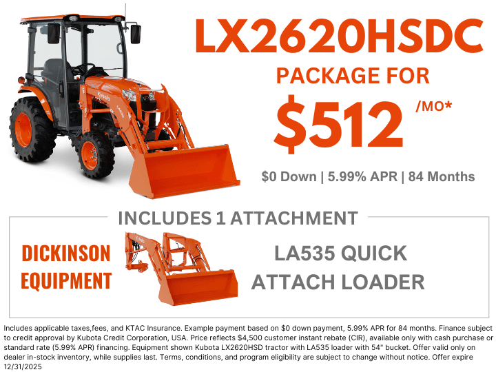 Includes applicable taxes,fees, and KTAC Insurance. Example payment based on $0 down payment, 5.99% APR for 84 months. Finance subject to credit approval by Kubota Credit Corporation, USA. Price reflects $4,500 customer instant rebate (CIR), available only with cash purchase or standard rate (5.99% APR) financing. Equipment shown Kubota LX2620HSD tractor with LA535 loader with 54" bucket. Offer valid only on dealer in-stock inventory, while supplies last. Terms, conditions, and program eligibility are subject to change without notice. Offer expire 12/31/2025